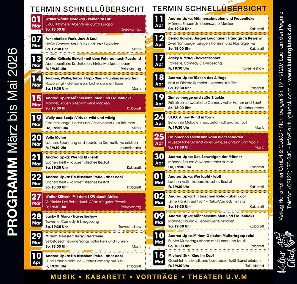 Ein optisch veränderter PZ-Kulturraum mit den gewohnten Kulturlieblingen wie Hopp-Sing mit Rainer Turba, TBC, Walter Költsch und anderen – ergänzt durch die Eigenproduktionen der Glückserei, wie Männerschnupfen, Tücken des Alltags, Konzerte mit Sonja und Wulli oder Travestie mit Jacky & Mara. Und immer wieder neue Premieren, die erste schon im Februar 2026 unter dem Motto ,,Alles bleibt – nur anders!“ von und mit Andrea Lipka.